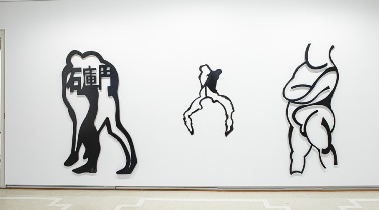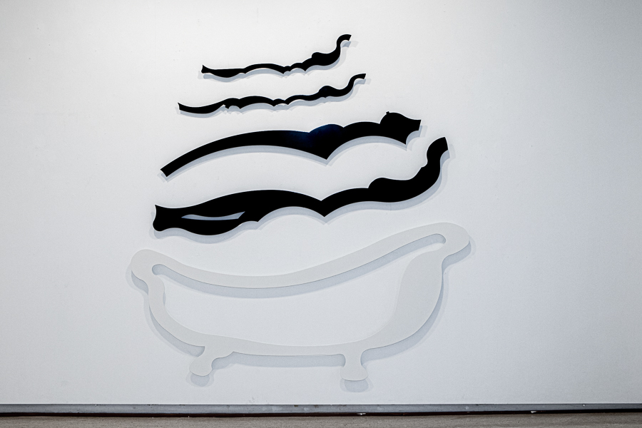 Cut from steel or MDF-board, the figures retain an airy and light feeling. The works settle into a space, slightly off the wall, as if they were part of the building’s architecture. The customary rectangular shape of a canvas is unambiguous. The artworks, cut to form, feel like an integral part of the space – created and owned by it.
