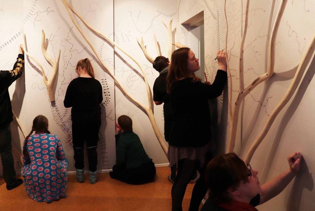 Installation view Mikkeli art museum Yksityiskohta kuvanveistäjä Juha Lahtisen puuelementeistäNäyttelyn viimeinen päivä, yleisön kanssa väritetään mustavalkoinen teos